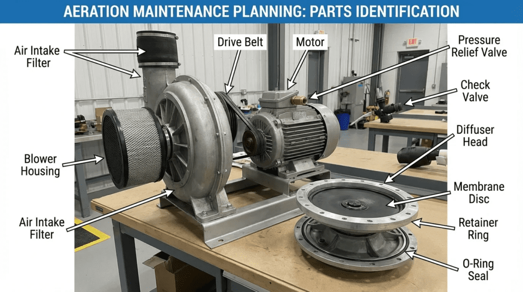 Best practices for Aeration Maintenance Planning: Parts suggest holding a minimum of 10% of a single basin’s total diffuser count (membranes, gaskets, and rings) in climate-controlled storage. Additionally, plants should stock two full sets of blower consumables (filters, belts, specialized lubricants) and at least one spare DO sensor or replacement cap per aeration zone.