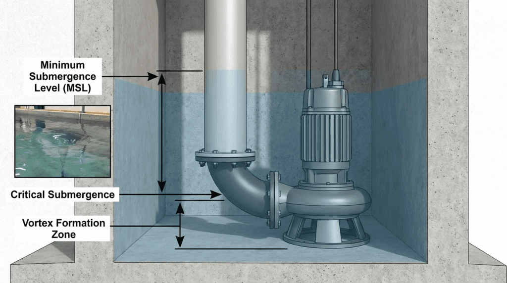Minimum submergence is calculated to prevent surface vortices that entrain air. A conservative calculation for wastewater applications is $S = 2.0 times D$, where $D$ is the suction pipe diameter. For example, a 6-inch suction line should have at least 12 inches of liquid above the inlet bell. Refer to the [[Design Details / Calculations]] section for ANSI/HI 9.8 formulas involving Froude numbers.