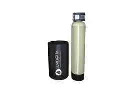 Water filtration system with a tall, beige cylindrical tank and a shorter black container labeled "Evoqua" on a white background.