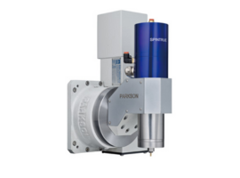 High-precision industrial machine tool with blue cylindrical component labeled "SHINTELE" and square base mounted on a metallic frame.