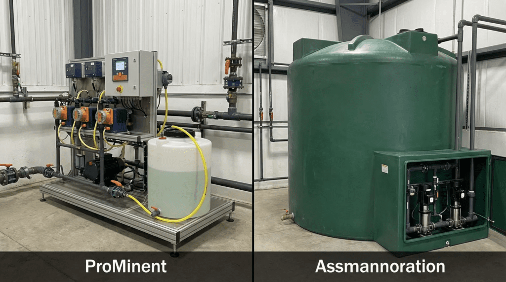 This comparison is relevant to consulting engineers and utility operators managing disinfection, fluoridation, pH adjustment, and polymer injection systems. While ProMinent is globally recognized for precision metering pumps, controllers, and pre-engineered skids, Assmann Corporation (often referenced in this context regarding “Assmannoration” or the integration of Assmann storage systems) is the standard-bearer for heavy-duty cross-linked polyethylene (XLPE) storage tanks and simple feed stations. The engineering challenge lies in determining whether a project requires the complex automation and high-turndown capabilities of a dedicated metering skid or the unified, footprint-saving simplicity of a tank-mounted feed system.
