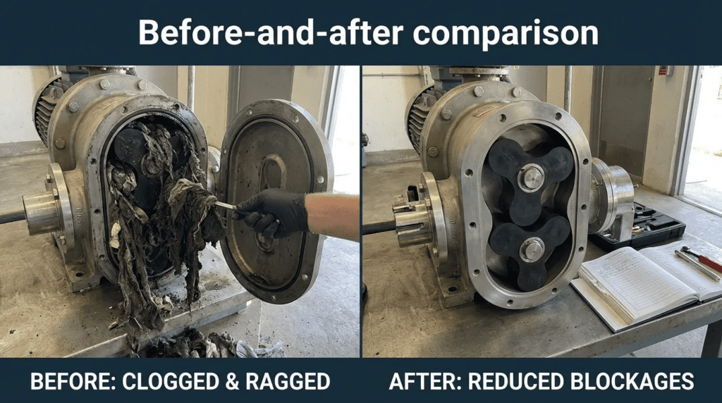 Preventive maintenance doesn’t stop clogging (which is an operational issue), but it prevents the damage caused by it. Operators should check oil levels weekly and inspect the lobe condition monthly. However, to reduce blockages, the focus should be on the control strategy. The “maintenance” of the anti-ragging setpoints (adjusting the amp trip level as the pump wears) is crucial. As the pump wears, its baseline amps decrease; if the trip point isn’t lowered, the pump may not detect a rag ball until it is too late.