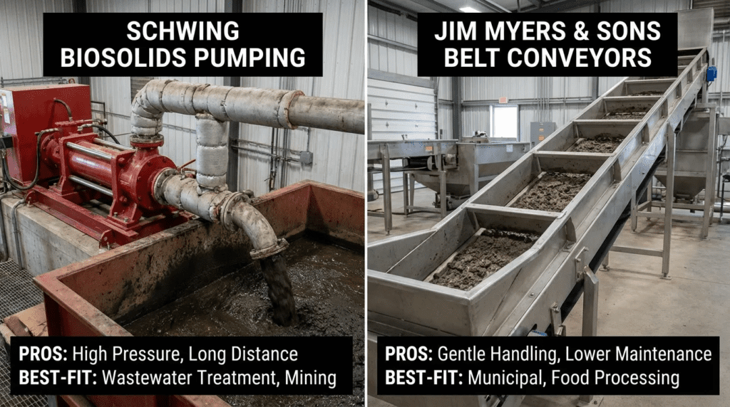 When designing these systems, the industry conversation often coalesces around two dominant methodologies, frequently represented by two market leaders: the hydraulic piston pump approach (synonymous with Schwing Bioset) and the mechanical screw conveyance approach (synonymous with Jim Myers & Sons, or JMS). While both manufacturers offer a range of equipment, in the context of consulting engineering, Schwing vs Jim Myers for Solids Conveyance: Pros/Cons & Best-Fit Applications essentially becomes a debate between high-pressure closed-pipe pumping and gravity-assisted mechanical auger transport.